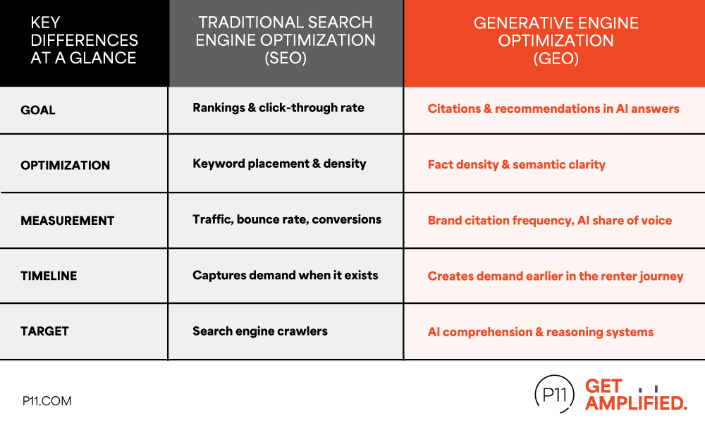 P11 has been obsessing over AI search behavior since the early days of answer engines. GEO isn’t a service we bolted on after reading a trade article — it’s baked into every website audit, content strategy, and digital recommendation we make. And because real estate is our sole focus (no retail clients, no B2B tech accounts, no one-size-fits-all playbooks), our GEO strategies are built specifically for the complexity of portfolio marketing, Fair Housing compliance, and multi-market property visibility.